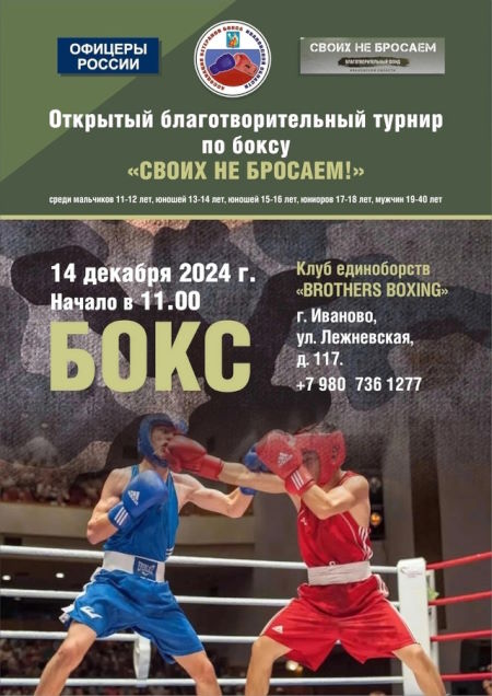 Впервые в Иваново Ассоциация ветеранов бокса Ивановской области совместно с региональным отделением Общероссийской организации «ОФИЦЕРЫ РОССИИ» в Ивановской области и благотворительным фондом «Своих не бросаем» в рамках марафона по сбору средств для бойцов СВО при поддержке директора ООО «Мой Фасон» С. С. Цветкова проводит открытый благотворительный турнир по боксу «Своих не бросаем».
